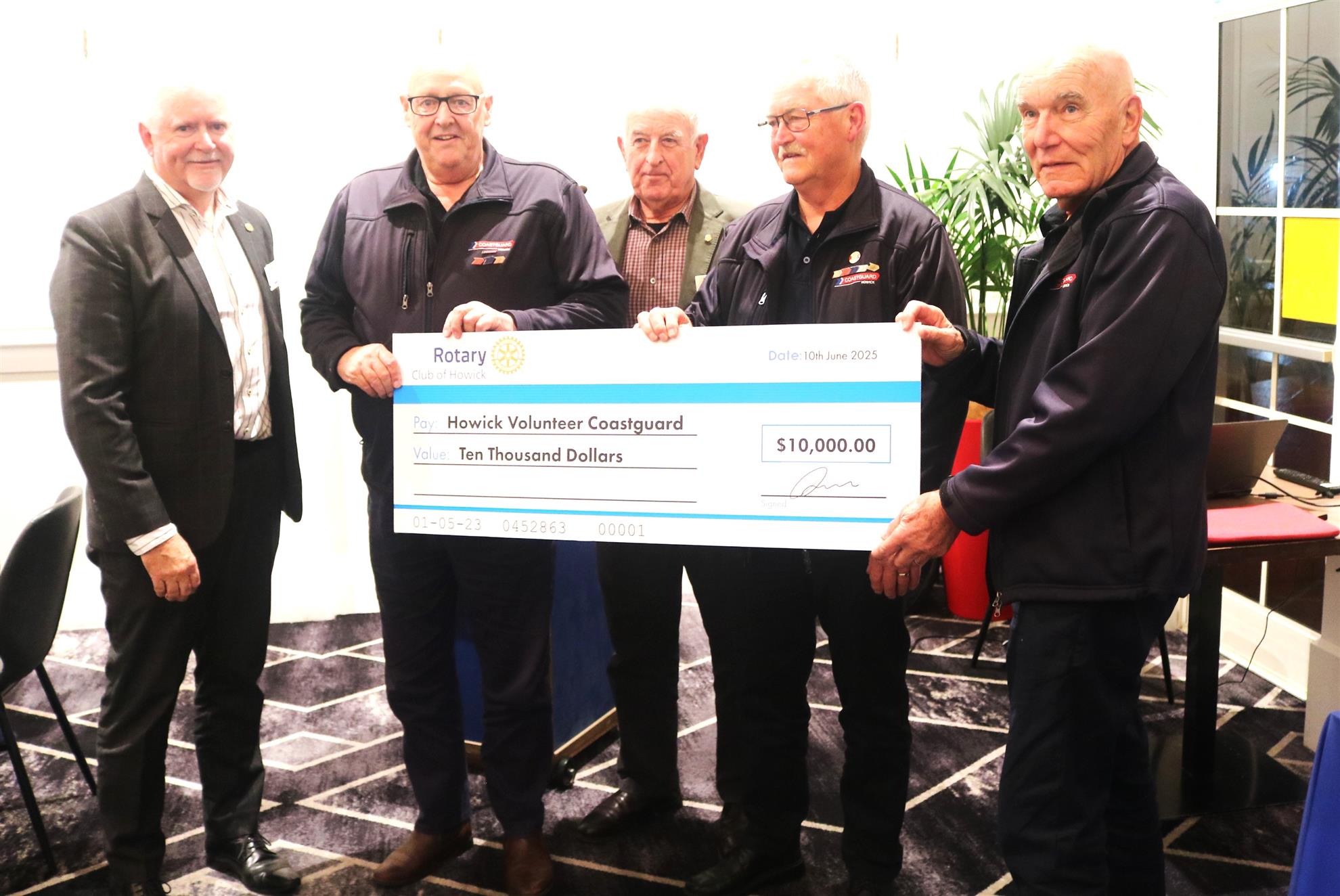 Malcolm thanked Howick Coastguard for their work in our community and we presented them with a cheque for $10,000. These funds will be used to update their radio equipment on the boat. Malcolm shared that to date our club has raised $80,000 for the Howick Coast guard.