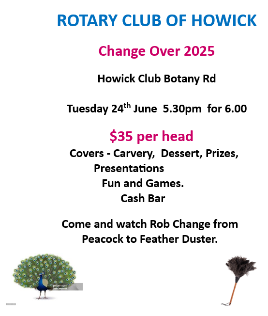 Our next meeting will be on 24 June and is our changeover night. Please email Glenice at glenice.yeoman@gmail.com to confirm your attendance or pass on your apologies. As usual this will be a night celebrating the previous year and a chance to welcome in the new Board.